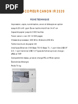 Source: 9409f0dc4580e894936fbde475eda04d.mesnotices.fr Le photocopieur canon ir 2520 est une solution multifonction d'une capacité de 20 pages par minute en noir et blanc.